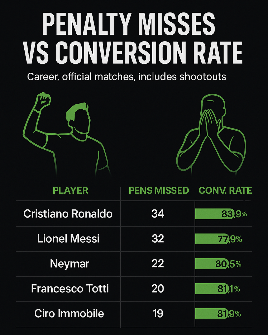 Cristiano Ronaldo appears at the top of that list with 34 career misses, yet he has also taken the most penalties and converted 177 of 211, an 83.9% rate in official matches. That is better than the historical average for spot kicks. Lionel Messi sits on 32 misses from 145, a 77.9% rate. Neymar is at 91 from 113, 80.5%. Francesco Totti finished 86 from 106, 81.1%. Ciro Immobile is 86 from 105, 81.9%. These figures treat shootouts as part of the ledger, which explains why the raw miss counts look high.
